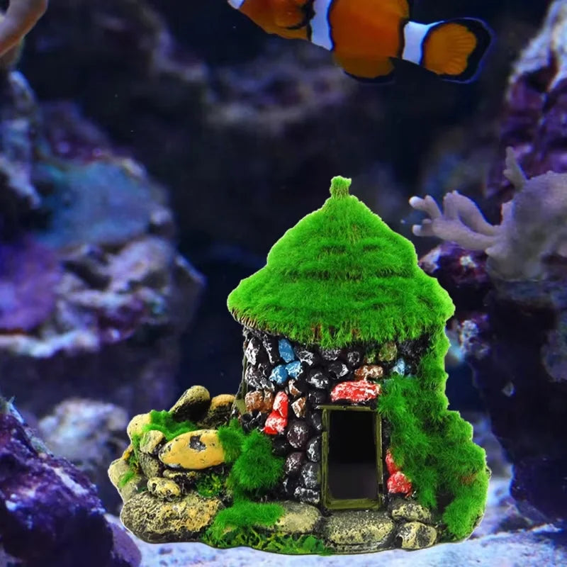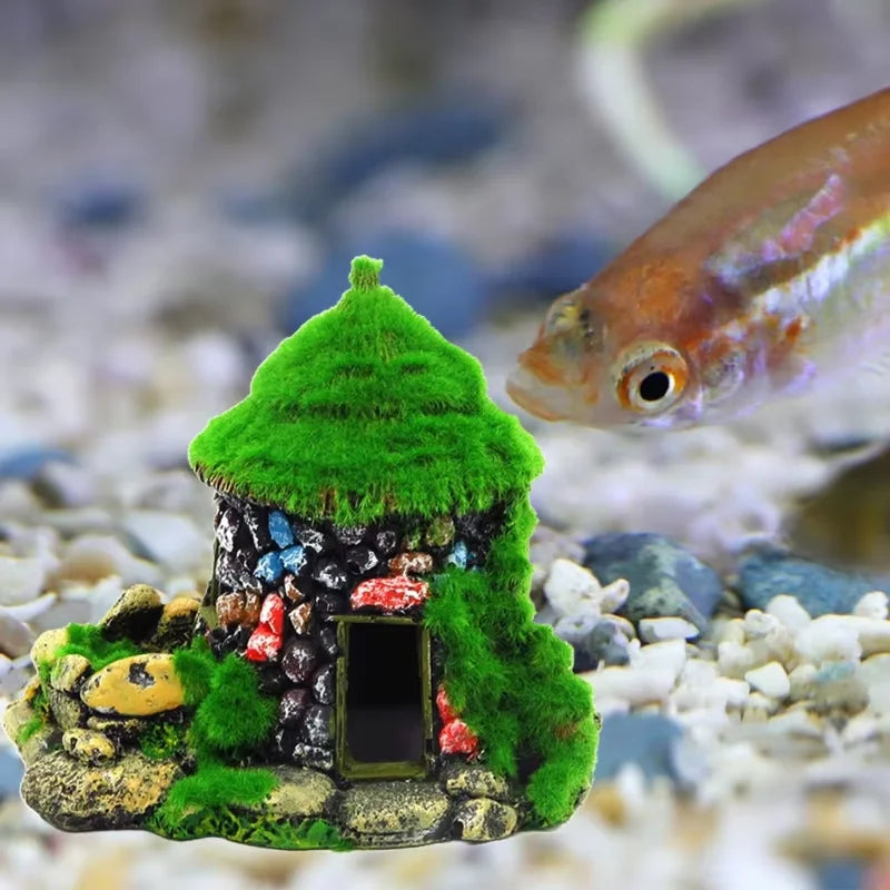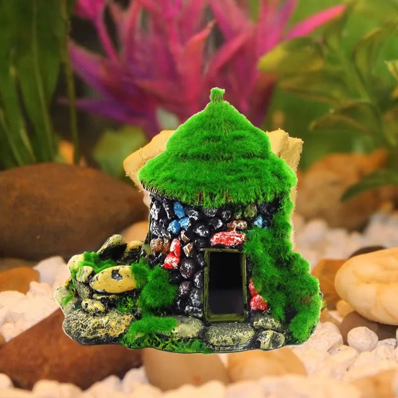 Aquarium Decoration House Resin House Betta Cave with Realistic Green Moss Fish Tank Ornaments Shelters Hideout Aquatic Rockery