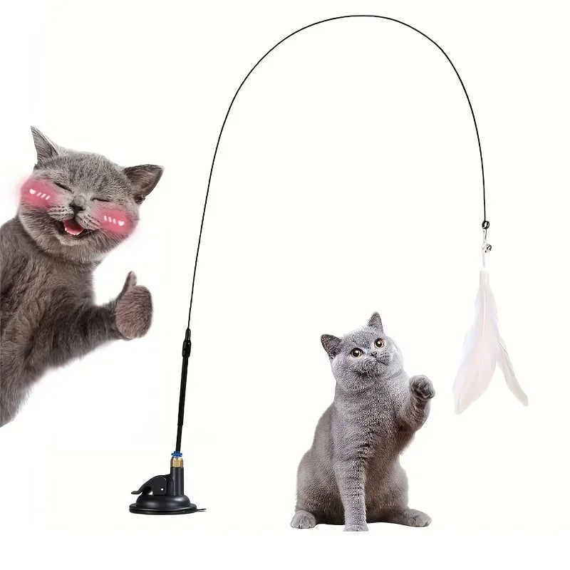 Bite-Resistant Cat Teaser Stick with Bell, Feather, and Long Rod - Fun and Interactive Cat Toy with Suction Cup Base